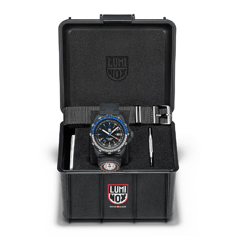 Constructed from lightweight yet ultra-durable CARBONOX™, the case is paired with a unidirectional rotating bezel featuring a two-tone aluminium ring insert. A striking blue bezel top, along with highlighted indexes from 9-12 and a bold second hand, add a distinctive splash of colour. The dial is protected by a sapphire crystal with anti-reflective coating, while 200-metre water resistance ensures reliability in the toughest conditions.