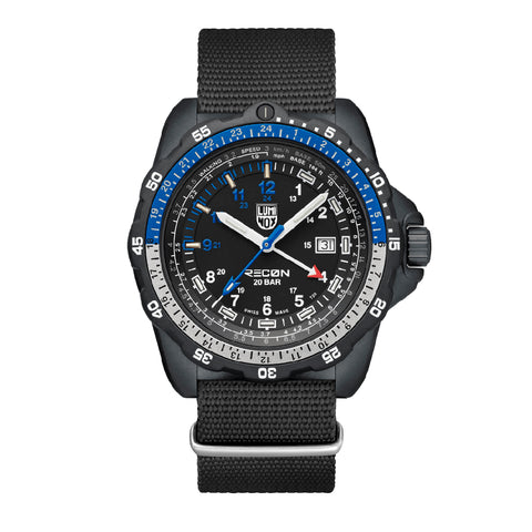 Powered by a Swiss quartz GMT movement, this watch allows you to track two time zones simultaneously, ideal for global missions or international travel. Its black nitrile rubber strap is engineered with integrated map scales and ruler markings, plus a detachable compass, transforming the timepiece into a complete navigation instrument. The set also includes an additional black webbing strap for added versatility.