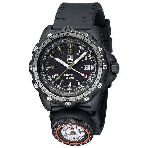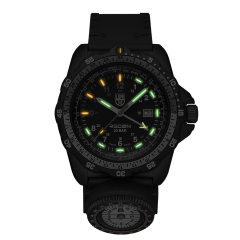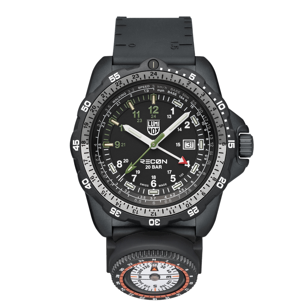 Powered by a Swiss quartz GMT movement, this watch allows you to track two time zones simultaneously, ideal for global missions or international travel. Its black nitrile rubber strap is engineered with integrated map scales and ruler markings, plus a detachable compass, transforming the timepiece into a complete navigation instrument. The set also includes an additional grasshopper green webbing strap for added versatility.