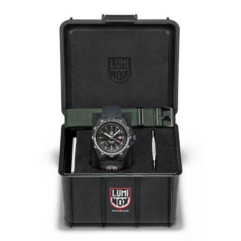 Crafted from lightweight yet ultra-durable CARBONOX™, the case is paired with a unidirectional rotating bezel featuring a two-tone aluminium ring insert. The bold design is accented with grasshopper green highlights on the 9-12 indexes and second hand, creating a striking visual contrast. A scratch-resistant sapphire crystal with anti-reflective coating safeguards the dial, while 200-metre water resistance ensures reliability in any environment.
